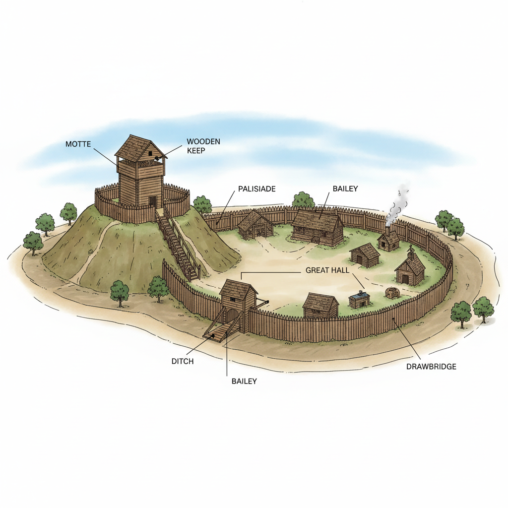 Avant la pierre, les châteaux étaient en bois et en terre. On construisait une tour sur une butte de terre artificielle (la motte) entourée d'une palissade.