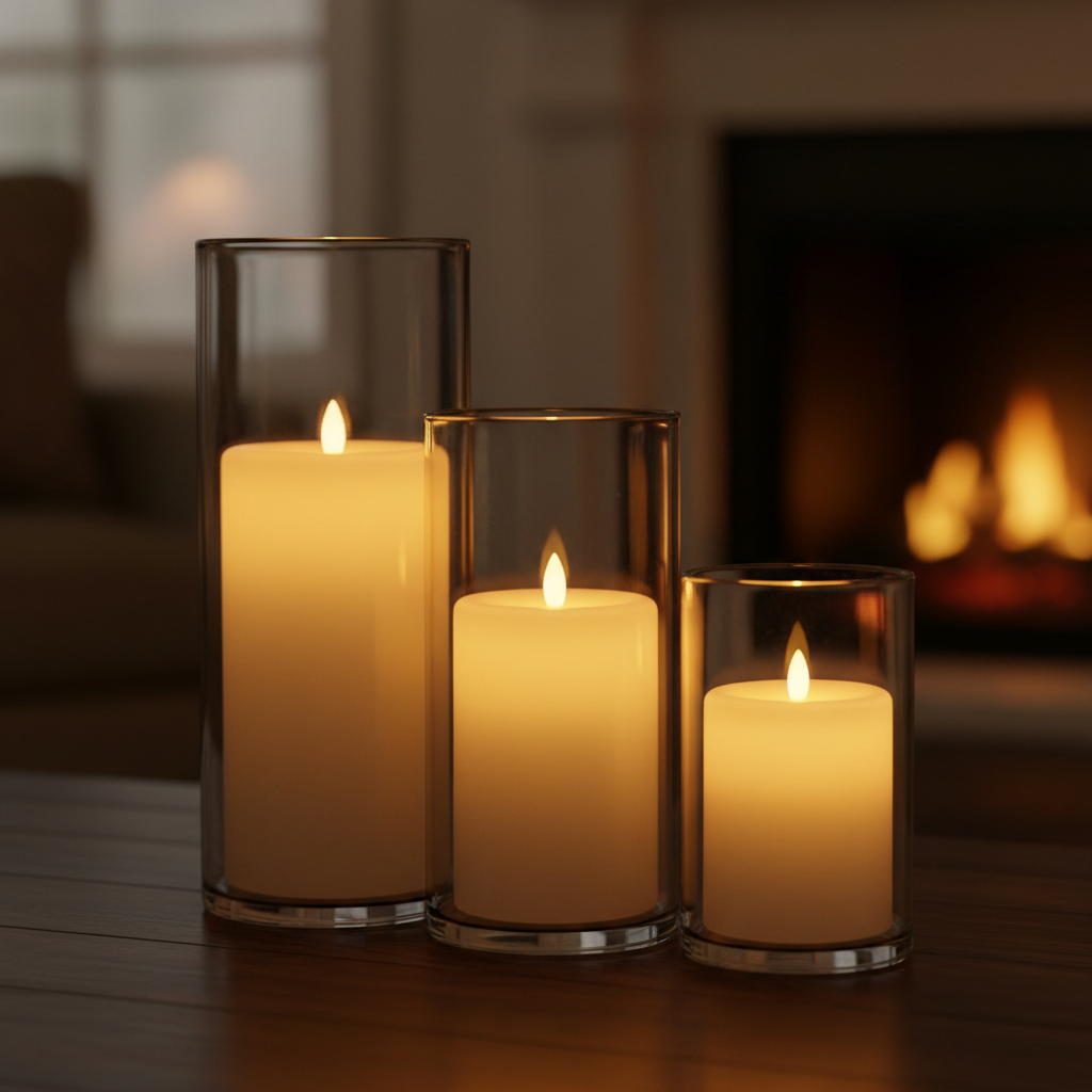 • Pillar candles (Varied heights) • Glass cylinders (Safety) • Tea lights + small holders • Lighterstick