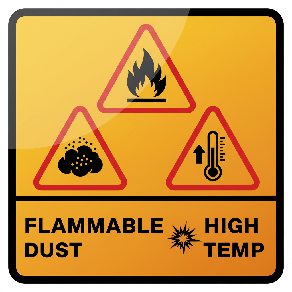 • Putekļu sprādziena risks (organiski materiāli)<br>• Karsto virsmu izolācija (apdegumu risks)<br>• Regulāra gultņu un padeves mehānismu eļļošana<br>• Gāzes degļu pārbaude