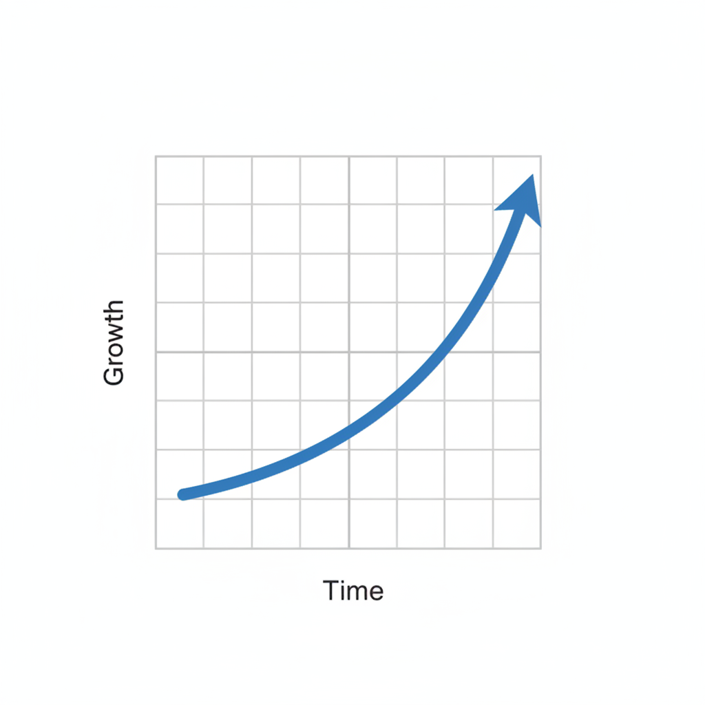 Exponential growth occurs when quantity increases by the same percentage (or factor) in each unit of time. The curve starts slowly and then shoots upward rapidly.