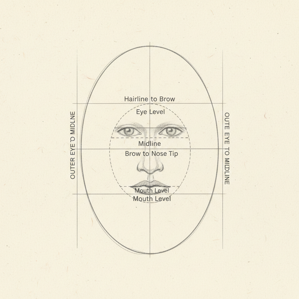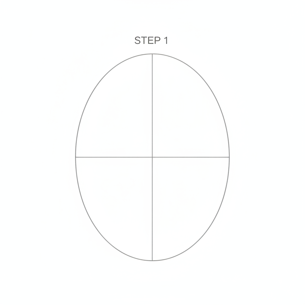 1. Кагазга жеңил сызык менен овал тартыңыз. 2. Тик (вертикал) сызык менен тең экиге бөлүңүз. 3. Туурасынан (горизонталь) сызык менен көздүн линиясын белгилеңиз.