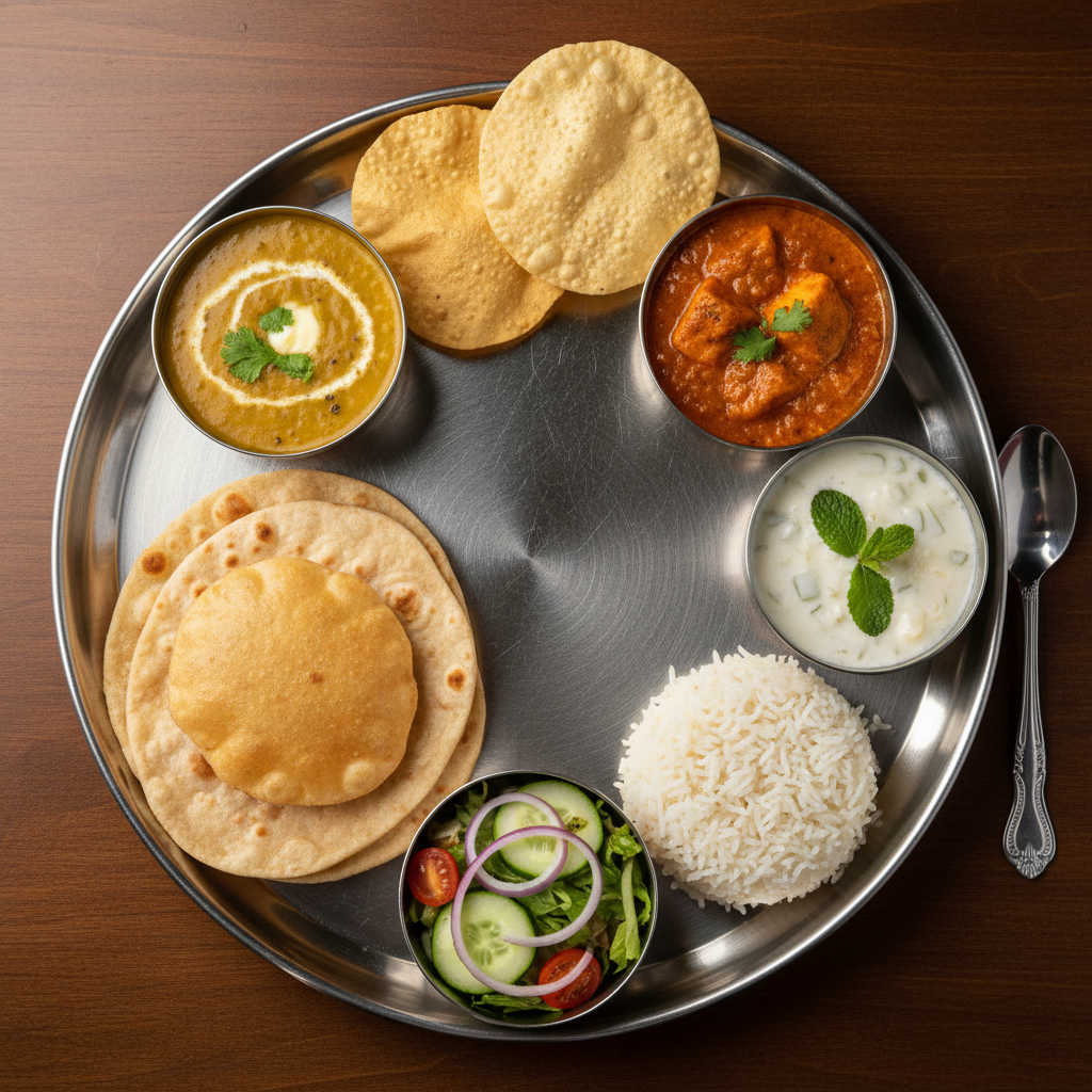 Soft textures (Dal, Rice) are complemented by crunch (Salads, Papad) and chew (Roti, Non-Veg).