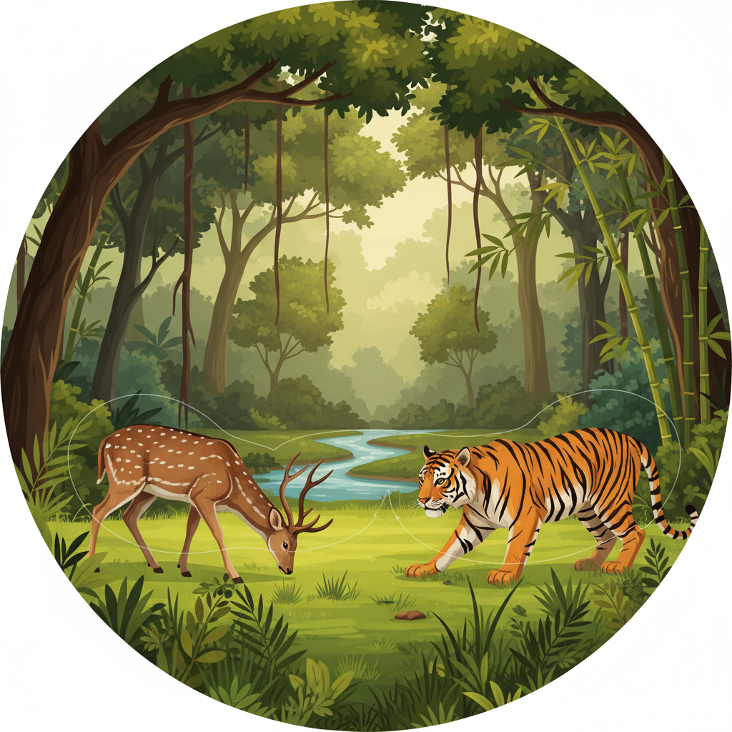 Forests are intricate ecosystems where energy flows from producers (plants) to consumers (herbivores and carnivores). In India's food chain, lush vegetation supports herbivores like the Chital and Sambar, which in turn support apex predators like the Tiger and Leopard, maintaining ecological balance.
