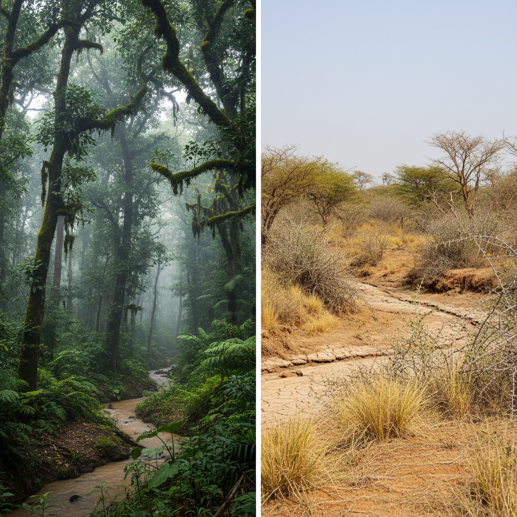 Mangrove Forests: Coastal deltas influenced by tides (Sundarbans).