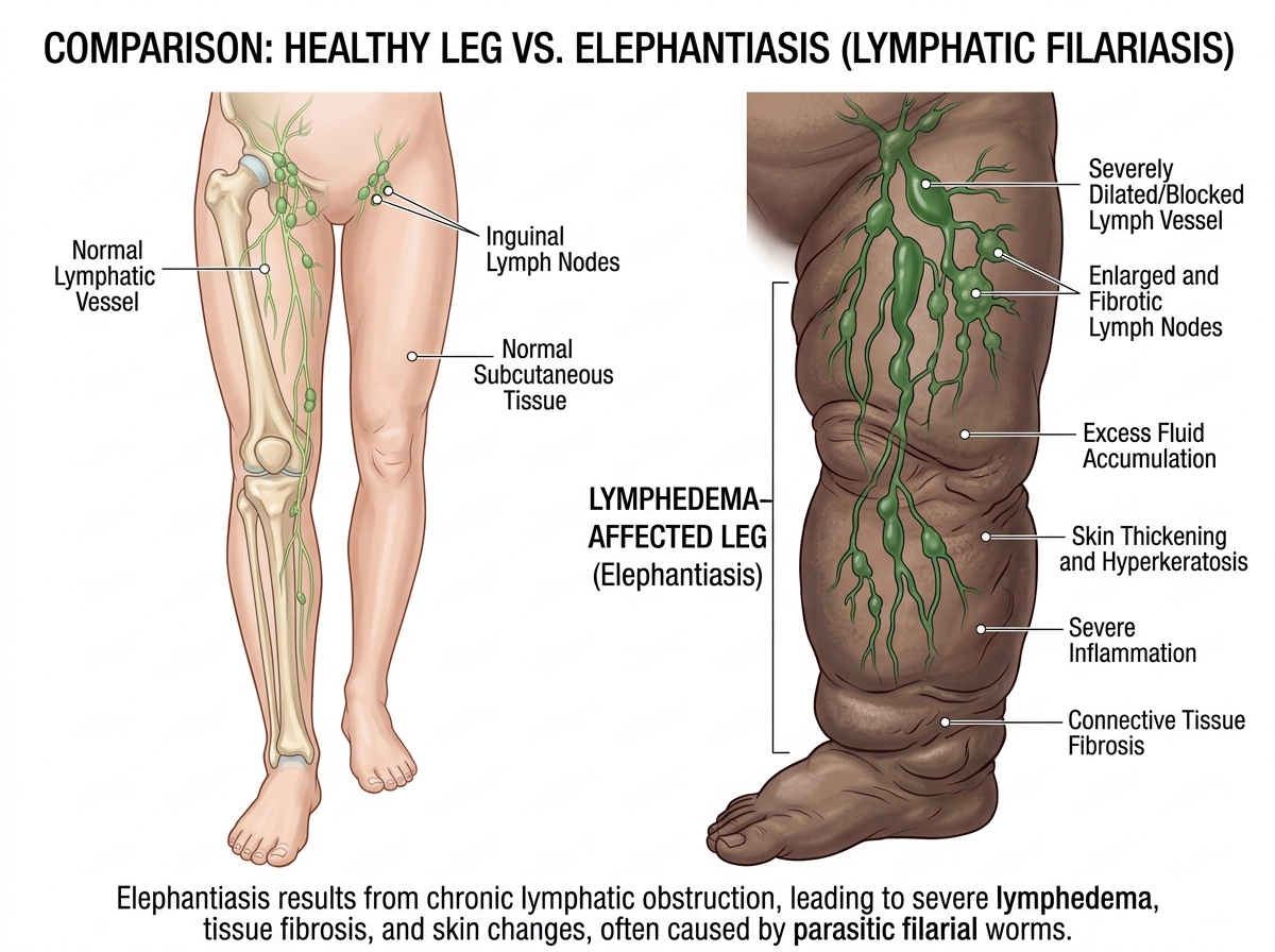 Explore the causes, symptoms, and treatment of Elephantiasis (Lymphatic Filariasis). Learn about the Wuchereria bancrofti parasite and global elimination efforts.