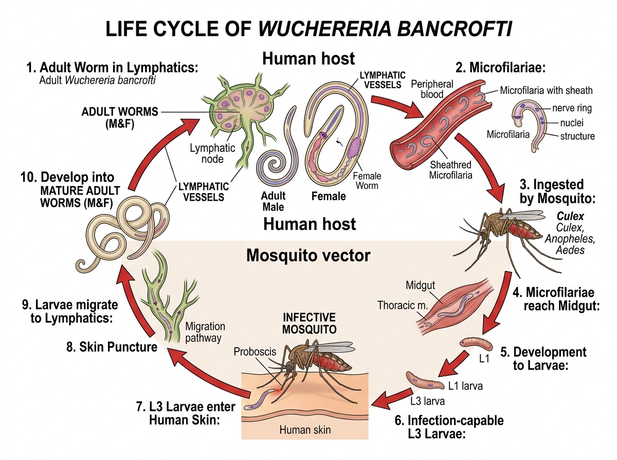 accounts for ~90% of all lymphatic filariasis cases globally. It is transmitted by mosquito bite.
