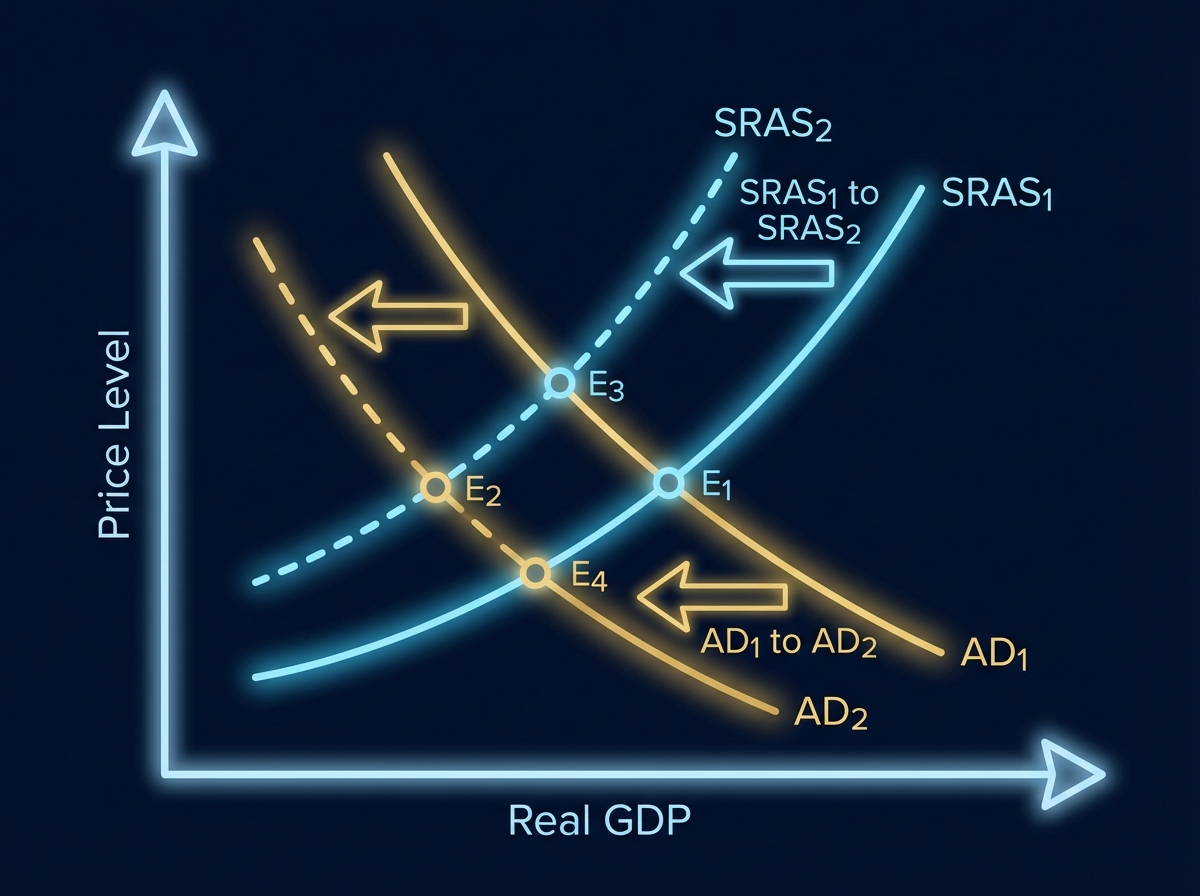 Reduced real output and elevated inflation driven by supply shocks and weakened aggregate demand.