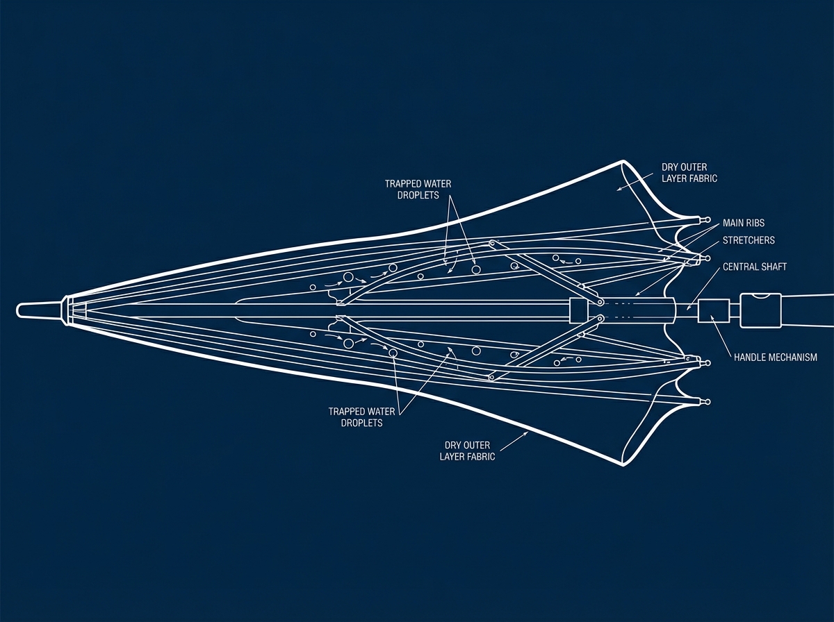 Our patented reverse-folding mechanism captures water inside the canopy as it closes, keeping the outer layer completely dry and preventing drips.