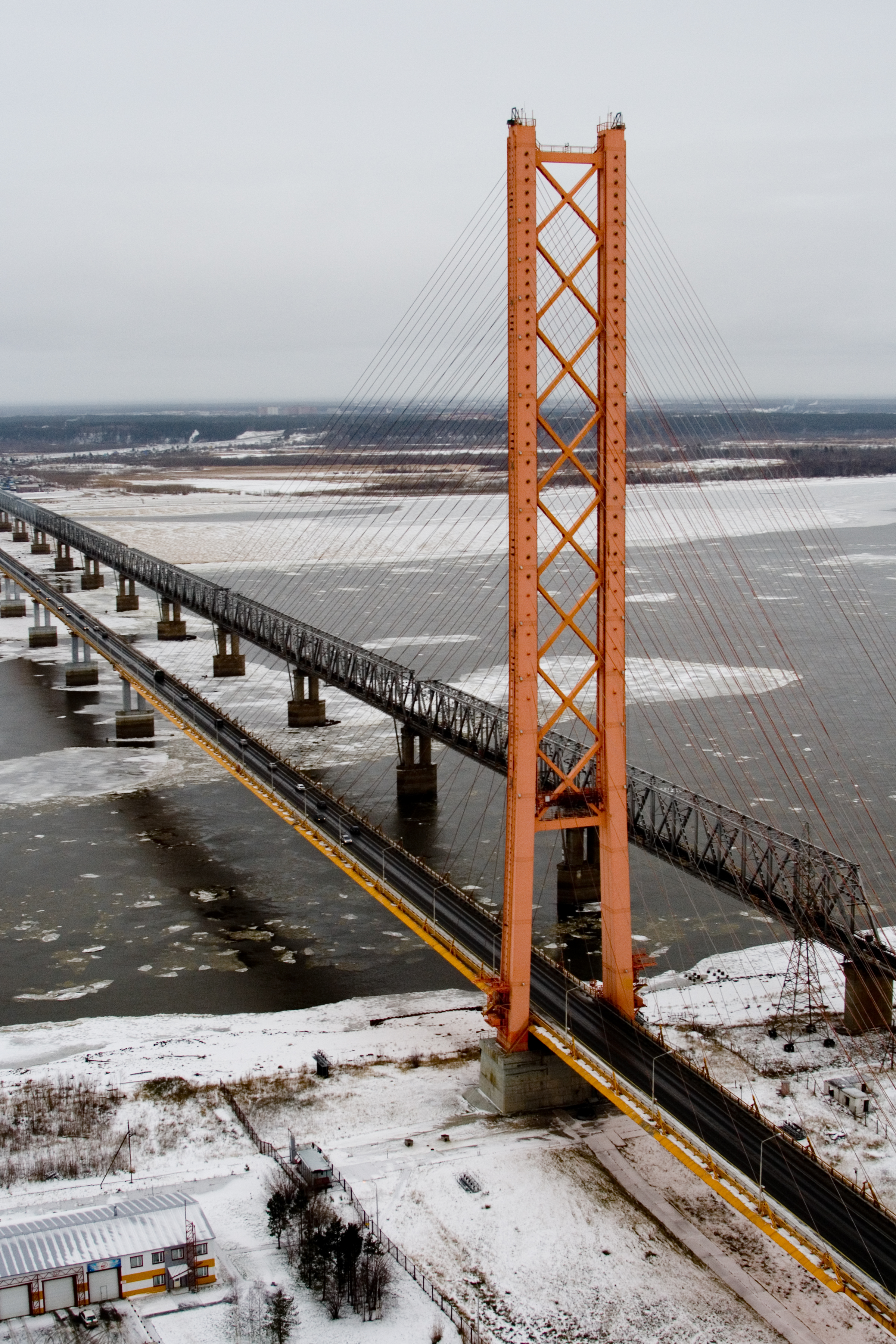 Один из длиннейших вантовых мостов в Сибири (2110 м). Важнейший узел, соединяющий запад и восток Сибири.