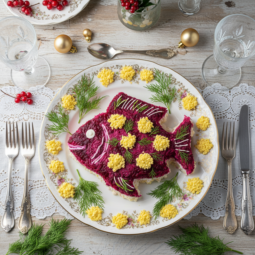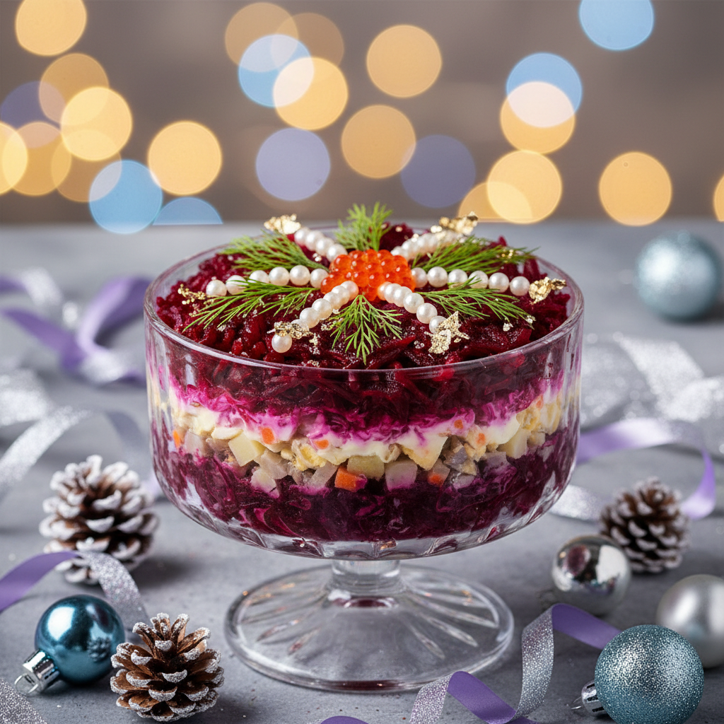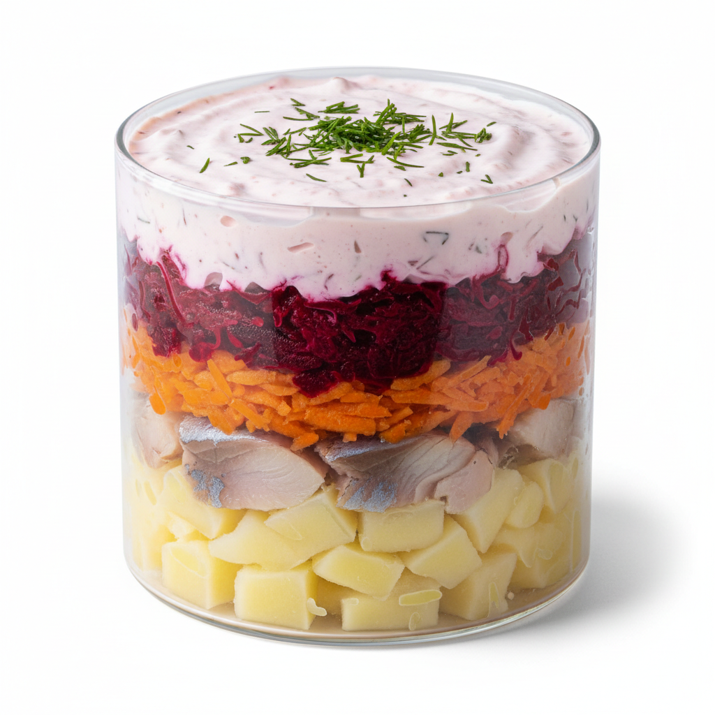 Это слоеный салат из соленой сельди и овощей, заправленный майонезом. Традиционное блюдо русской кухни, ставшее неотъемлемой частью празднования Нового года и Рождества на постсоветском пространстве. Его уникальный вкус создается благодаря балансу соленой рыбы и сладких вареных овощей.