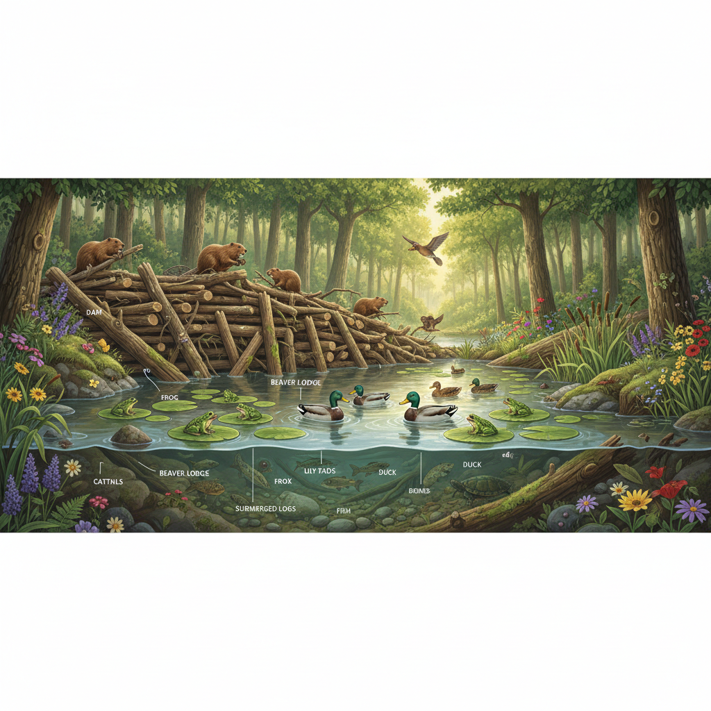 Бобры создают пруды. В этих прудах поселяются рыбы, утки, лягушки и насекомые. Мы дарим дом другим животным!