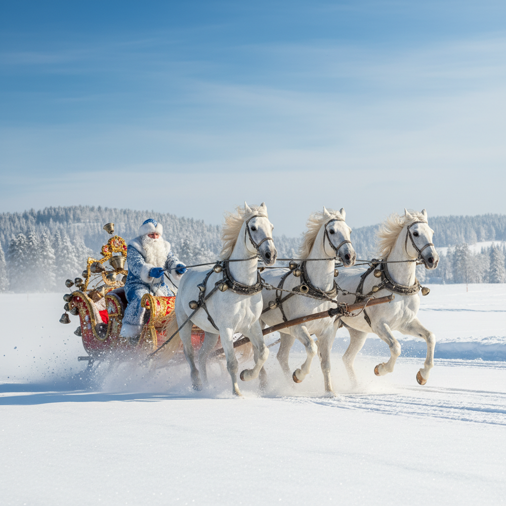 Дед Мороз передвигается на русской тройке. Лошади часто символизируют три зимних месяца: Декабрь, Январь и Февраль.