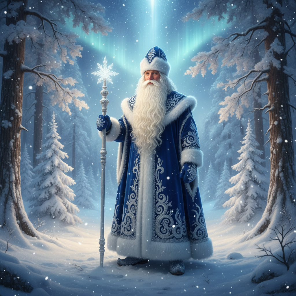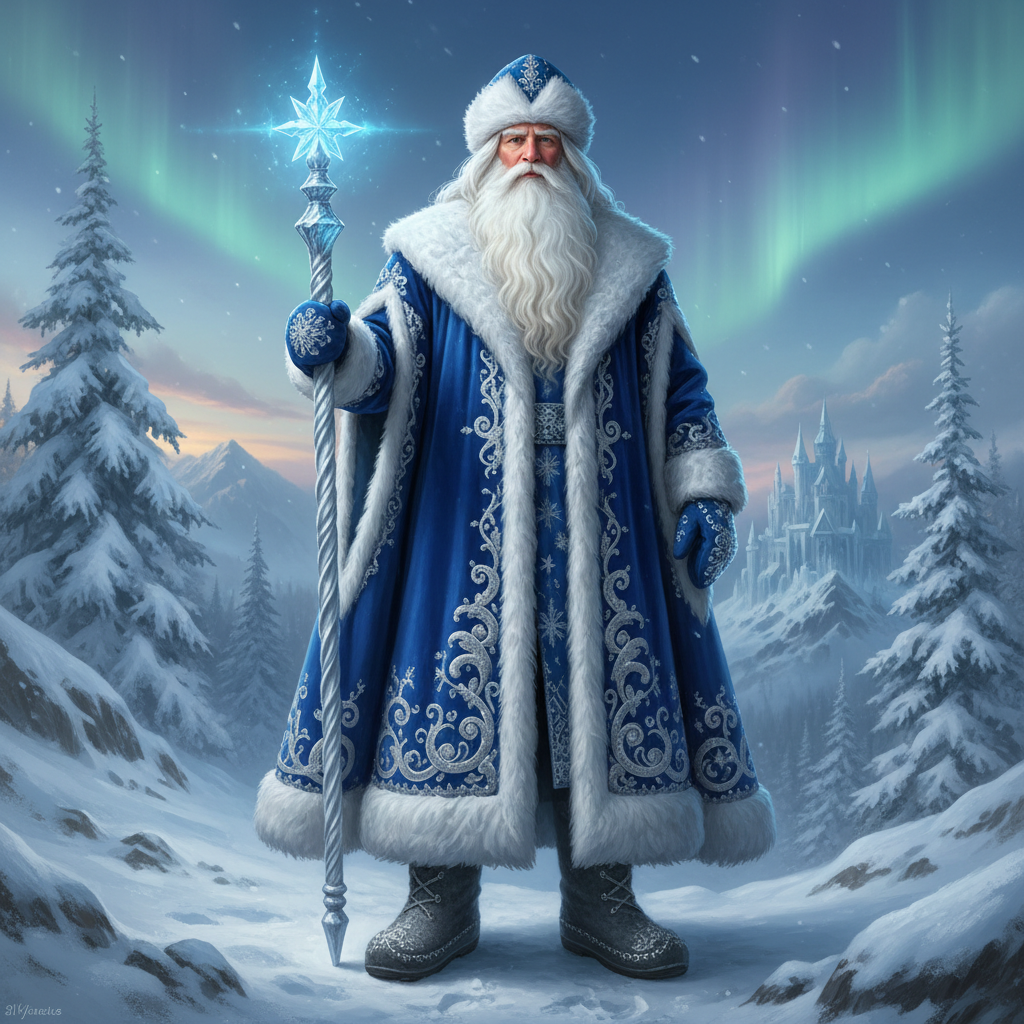 В отличие от Санта-Клауса, наш Дед Мороз носит длинную шубу (синюю или красную) до пят, валенки, и не использует очки. В руках он всегда держит волшебный посох, ударом которого может заморозить реки.