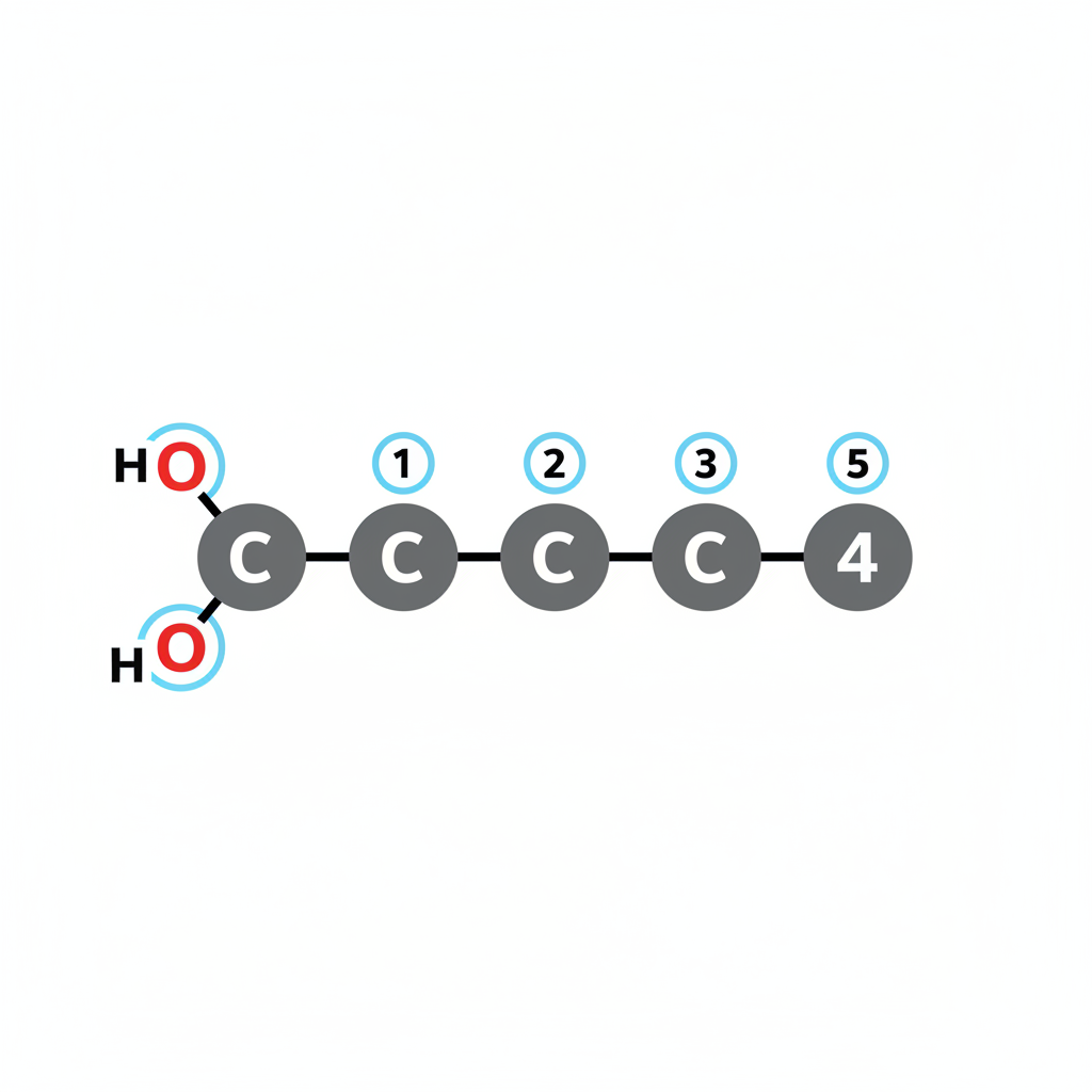 Нумерация начинается с атома углерода карбоксильной группы (C1). Например: H-COOH (метановая), CH3-COOH (этановая). При разветвленной цепи указывается положение радикалов.