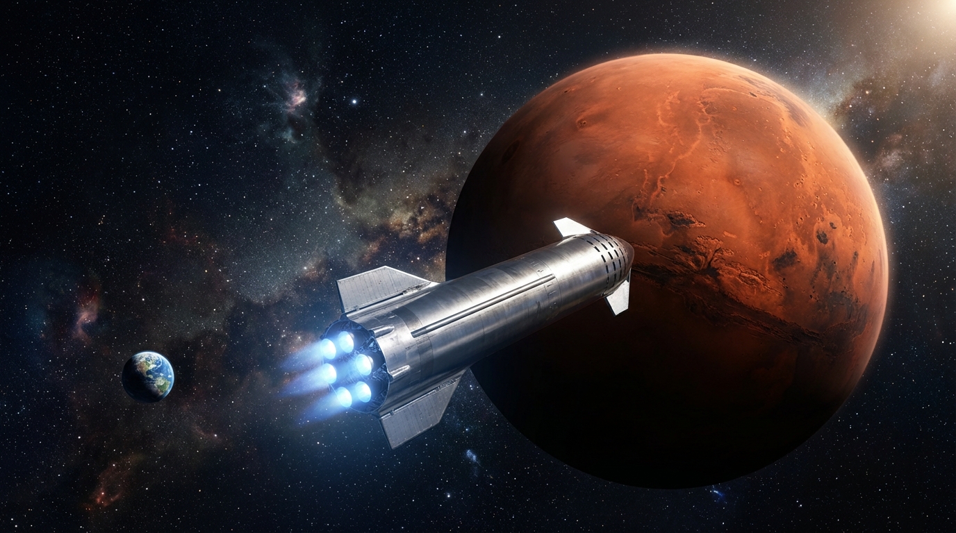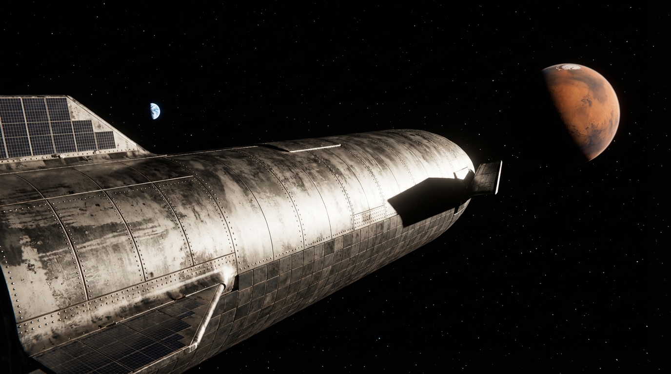 Discover the roadmap for humanity's multiplanetary future, featuring Starship technical specs, the Deep Space Transit phase, and Mars Base Alpha plans.
