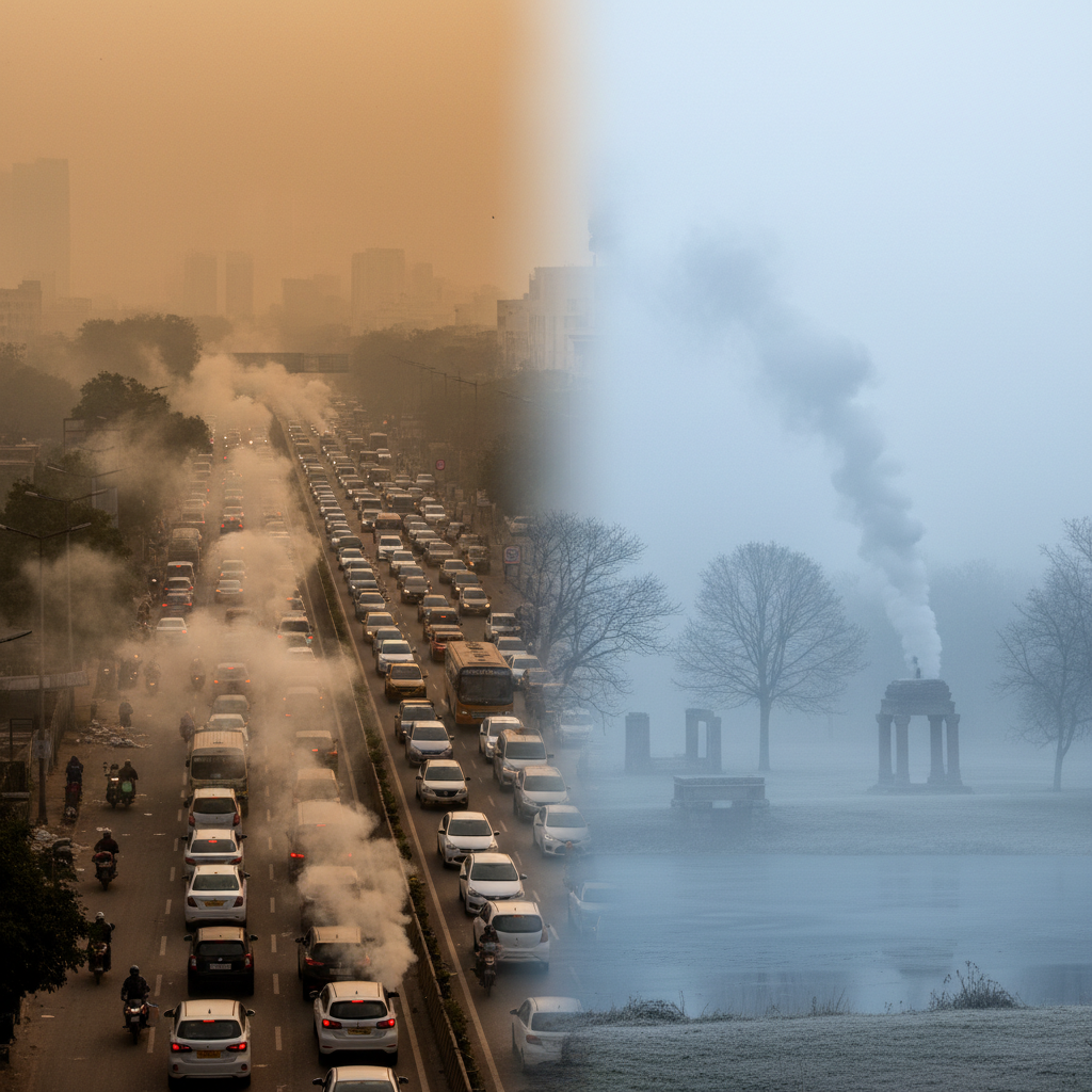 PRIMARY FACTORS: 1. Meteorological: Low wind speeds (<10kmph), dense fog, and low ventilation index trap pollutants. 2. Vehicular Load: Heavy traffic density across NCR. 3. Regional Disparity: Inadequate monitoring in neighboring cities (e.g., Haryana) hides the full extent of regional drift.