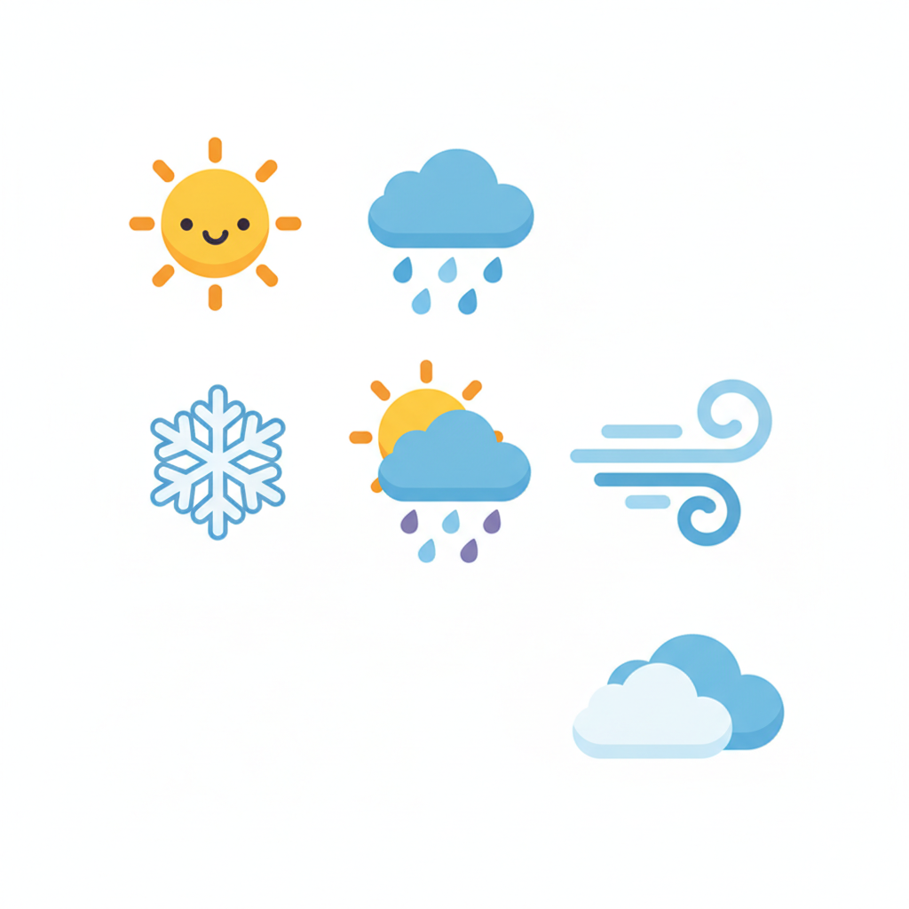 <ul><li><strong>Sunny</strong> (Солнечный)</li><li><strong>Rainy</strong> (Дождливый)</li><li><strong>Cloudy</strong> (Облачный)</li><li><strong>Snowy</strong> (Снежный)</li><li><strong>Windy</strong> (Ветреный)</li><li><strong>Sunny & Rainy</strong> (Грибной дождь)</li></ul>