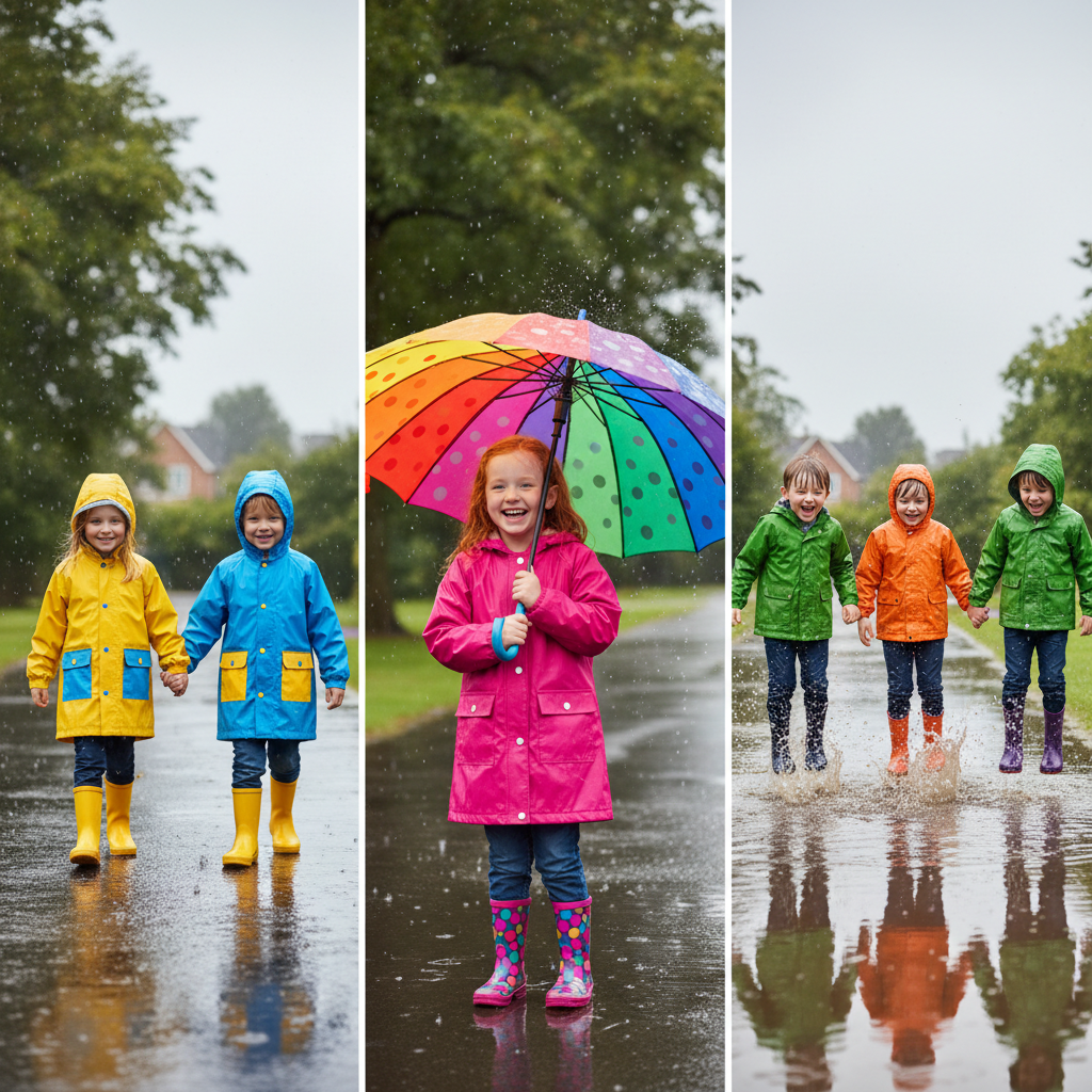 <li>What are the children wearing?</li><li>Why has Liz opened her umbrella?</li><li>Where are the children?</li>