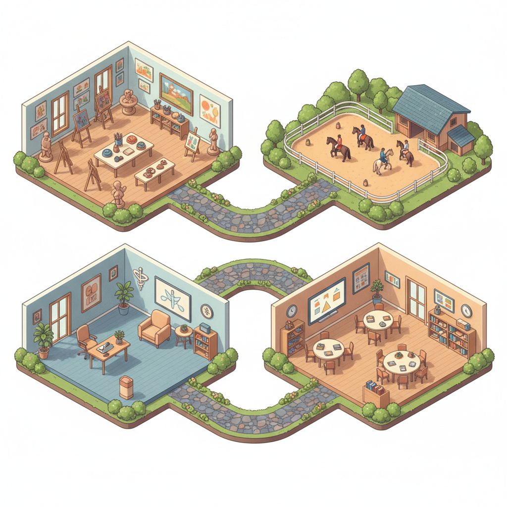 العلاج بركوب الخيل يوفر تحفيزاً حسياً عميقاً يساعد على التوازن والشعور بالحركة. كما أن 'رياضة الدماغ' (26 حركة) تساعد في الربط بين الحركة والوظائف الدماغية لتحسين مهارات التعلم.