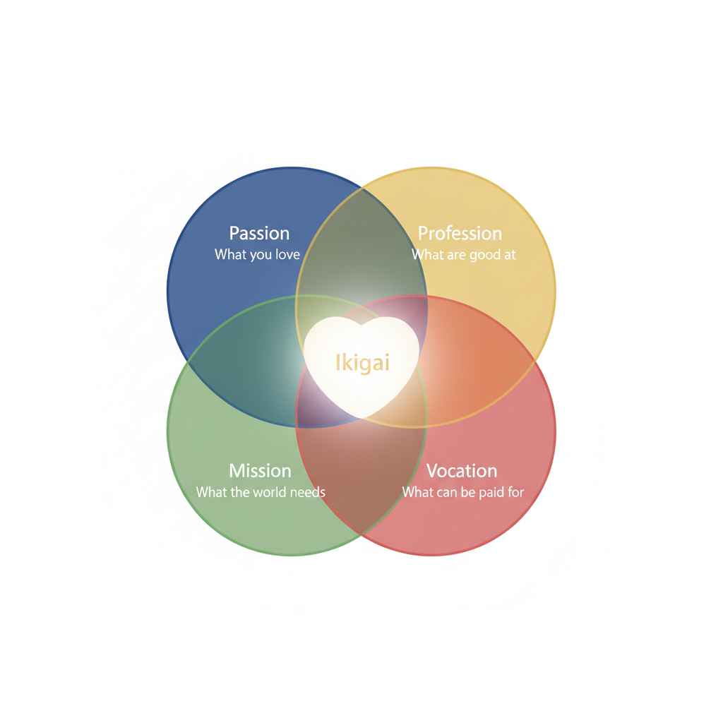 Идеальная профессия находится на пересечении четырех сфер: 1) То, что вы любите делать. 2) То, что у вас хорошо получается. 3) За что платят деньги. 4) Что нужно миру. Если выпадает хоть один элемент, гармония нарушается.