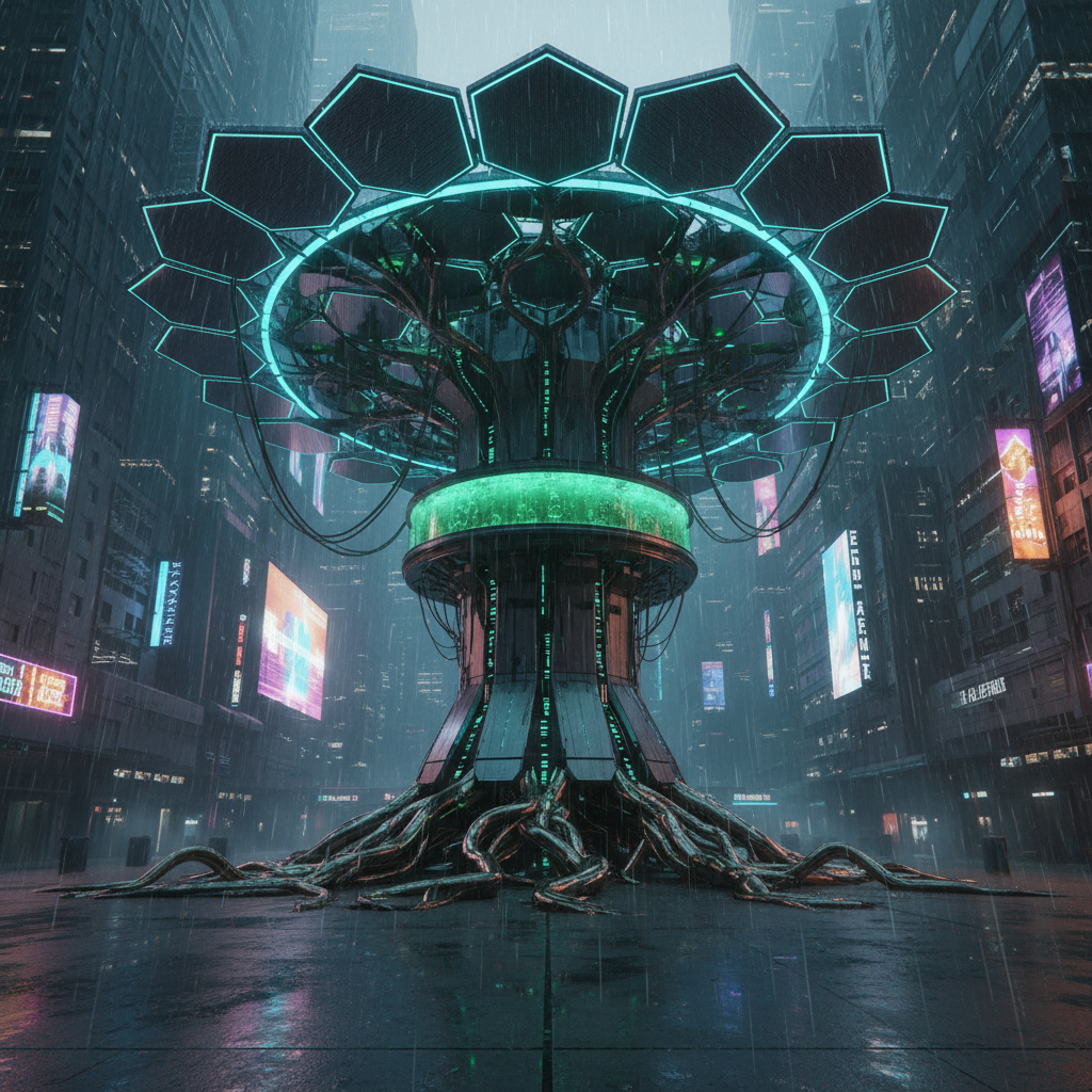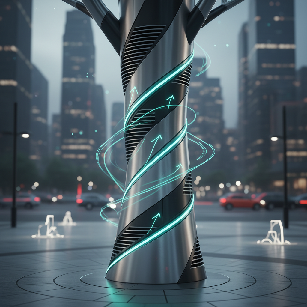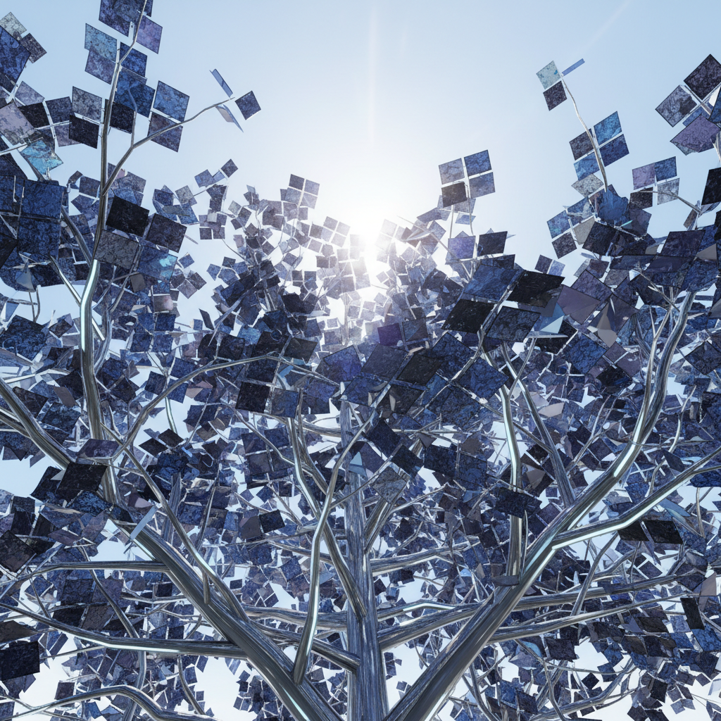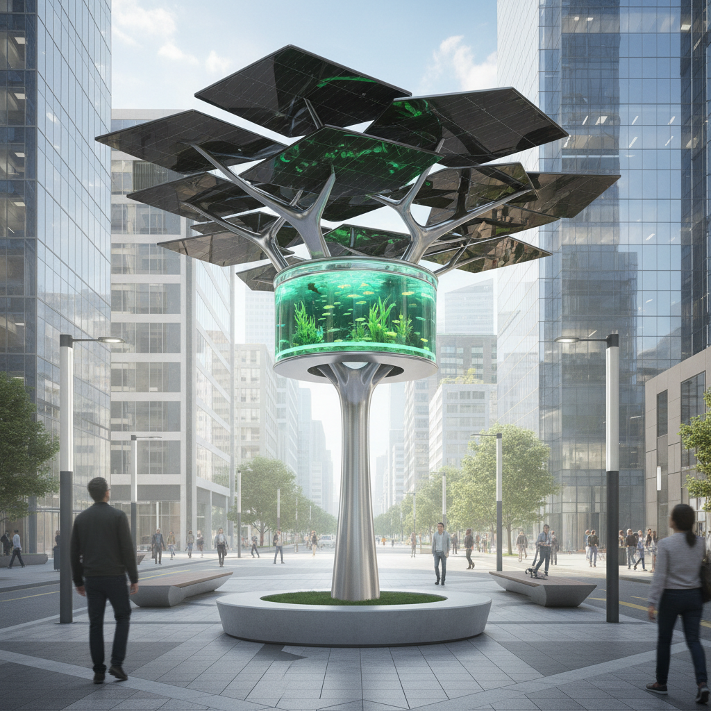 Инсталляция представляет собой высокотехнологичное «дерево» высотой 4 метра. Это не просто арт-объект, а функциональная станция очистки воздуха. Конструкция объединяет солнечную энергетику, биологическую очистку хлореллой и механическую фильтрацию пыли, создавая оазис чистого воздуха в городской среде.