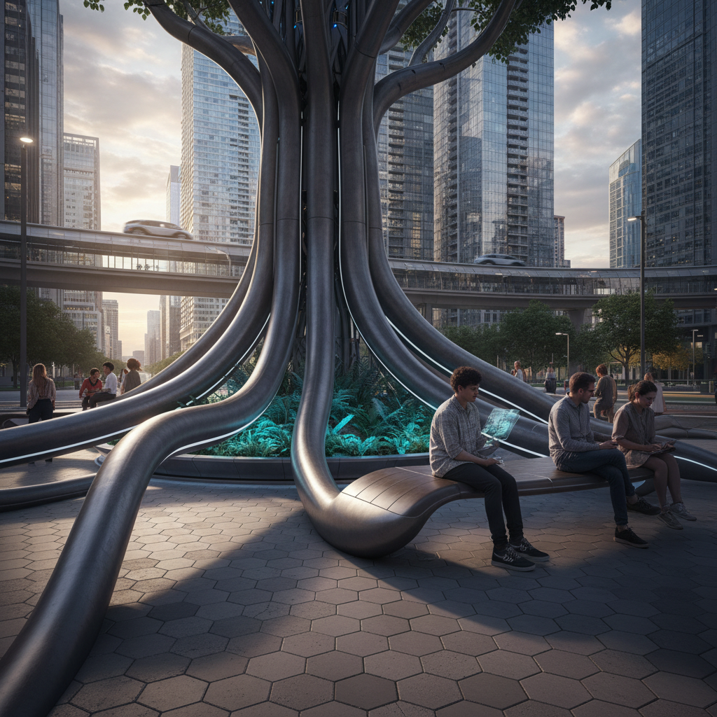 Устойчивость всей 4-метровой конструкции обеспечивается мощным основанием. Стилизованные металлические корни не только служат опорой, но и интегрируют объект в городской ландшафт, создавая места для сидения пешеходов (скамьи) между корневыми выступами.
