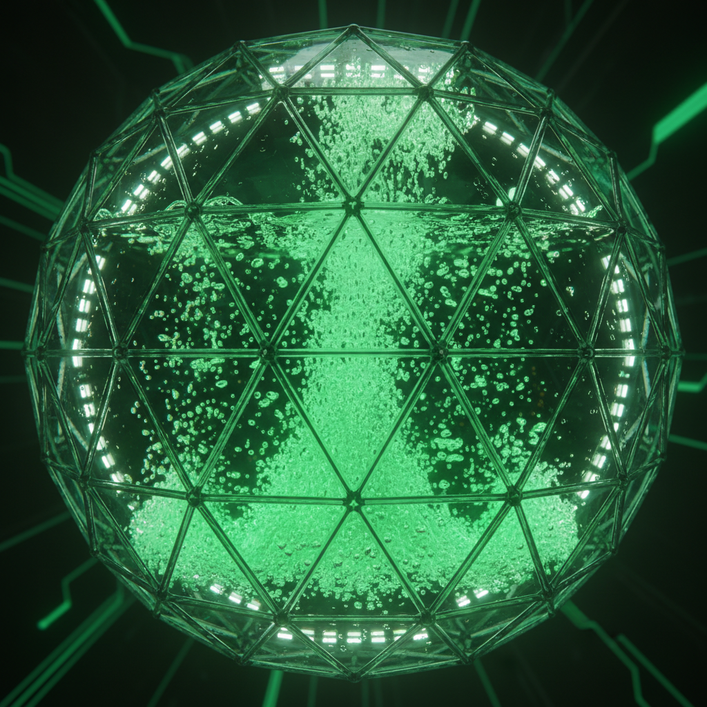 На высоте 2,4 метра расположен круговой аквариум высотой 50 см. Он состоит из треугольных стеклянных секций, наполненных культурой хлореллы. Эта микроводоросль активно поглощает углекислый газ и выделяет кислород, работая как «легкие» установки. Зеленое свечение создает эффект живой энергии.