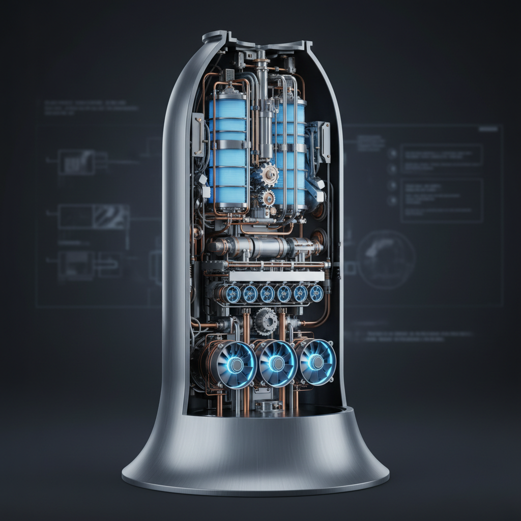 «Ствол» — это основная магистраль системы. Внутри установлена мощная фильтро-вентиляционная установка (ФВУ). Она принудительно затягивает запыленный городской воздух, прогоняет его через систему механических фильтров, а затем подает очищенный воздух вверх, насыщая его кислородом от зоны с хлореллой.