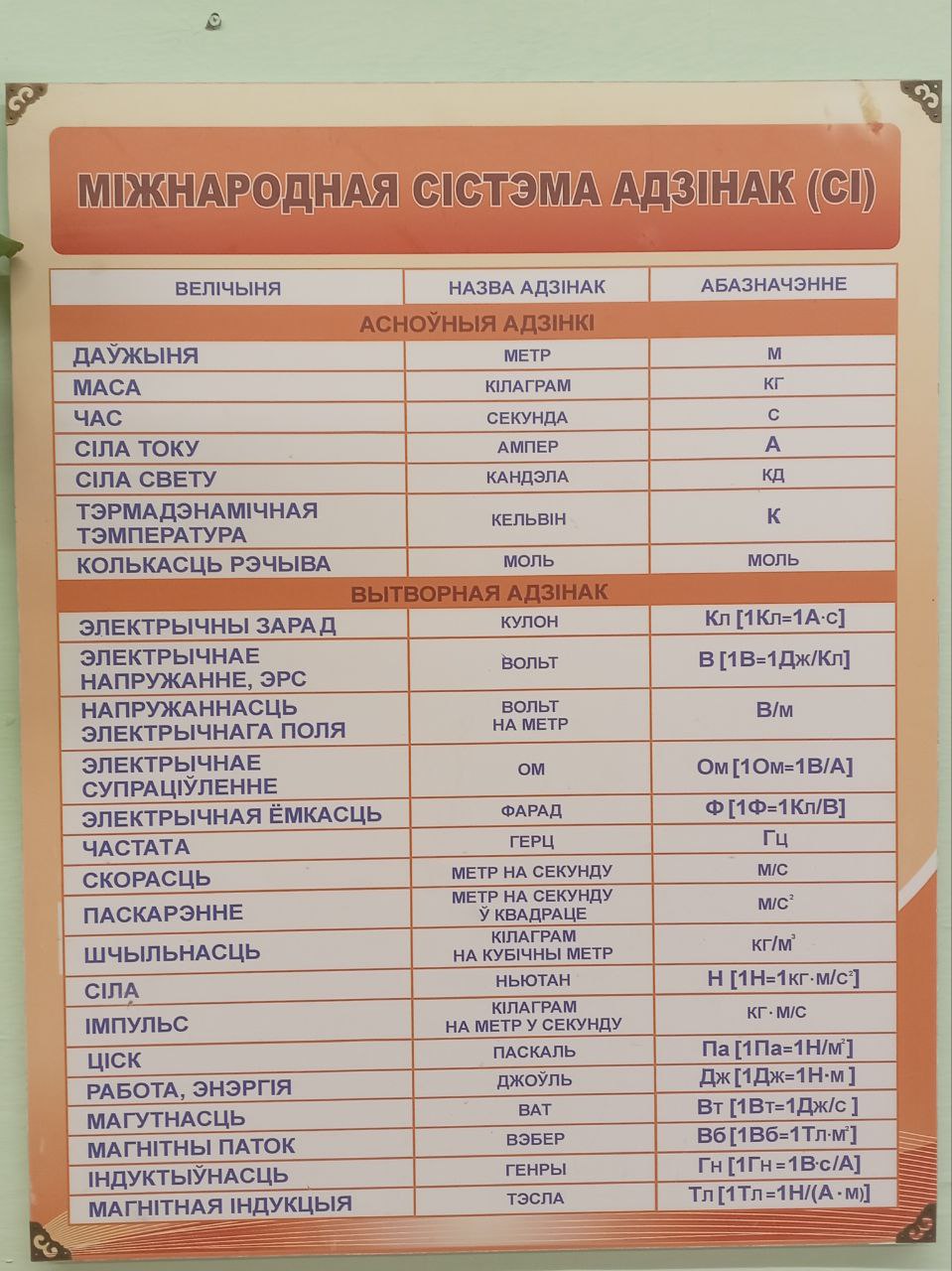 Інфармацыйны стэнд з табліцай асноўных і вытворных адзінак вымярэння. Гэта важны інструмент для фарміравання культуры фізічных вылічэнняў і правільнага афармлення задач.