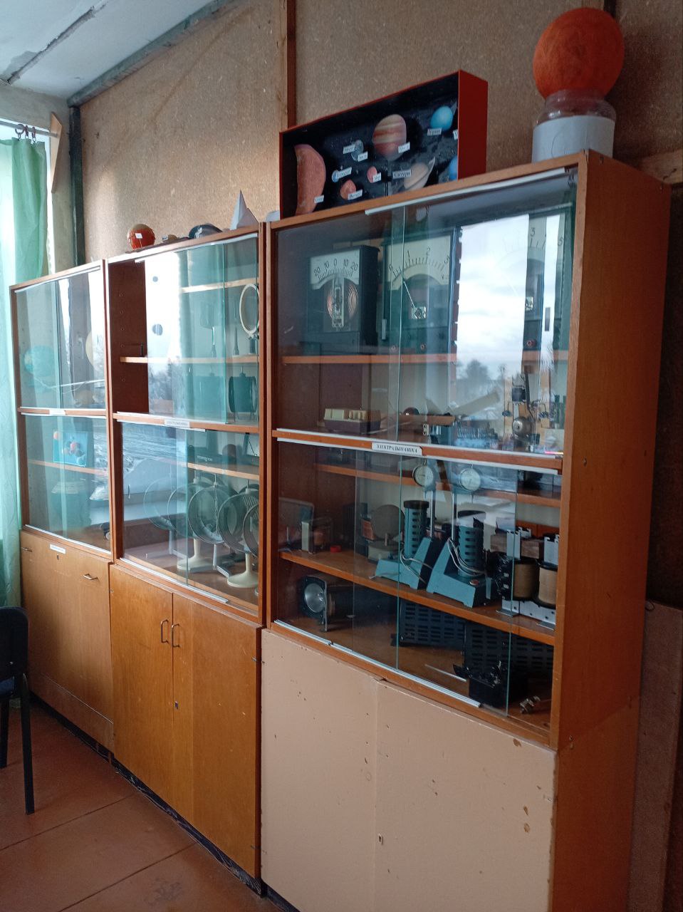 Кабінет абсталяваны шафамі са склянымі дзверцамі, дзе акуратна захоўваюцца прылады для дэманстрацый і практычных работ: электраскопы, крыніцы току, оптыка і мадэлі.