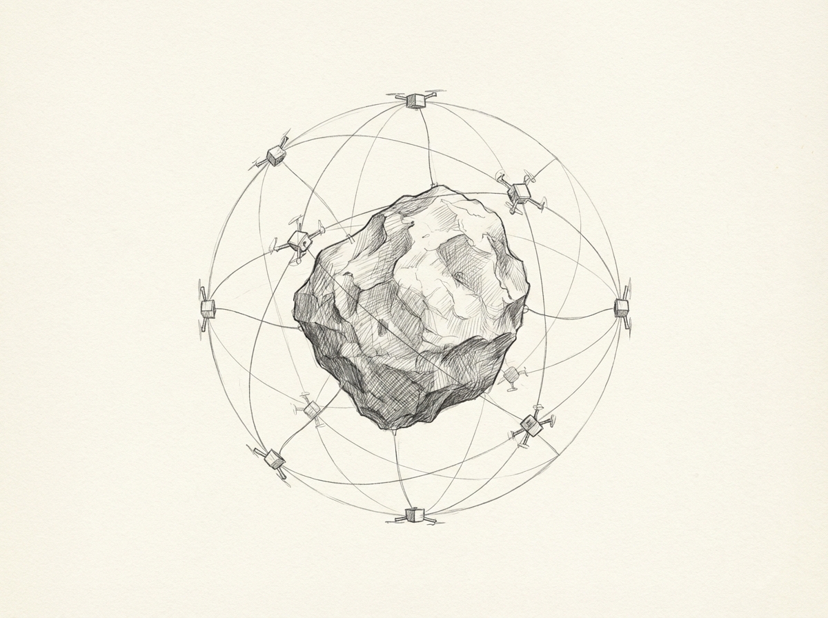 A coordinated matrix of high-yield drones deploys cybernetically synced tethering cables to enclose the target asteroid entirely.