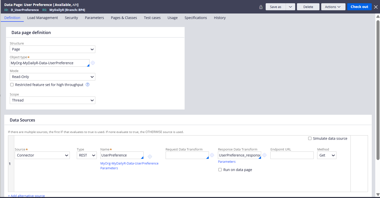 Opening the rule in Dev Studio reveals the underlying Data Page definition. We can see the Data Source configured as a 'Connector' of type 'REST', linking to the transforms and endpoint newly created.
