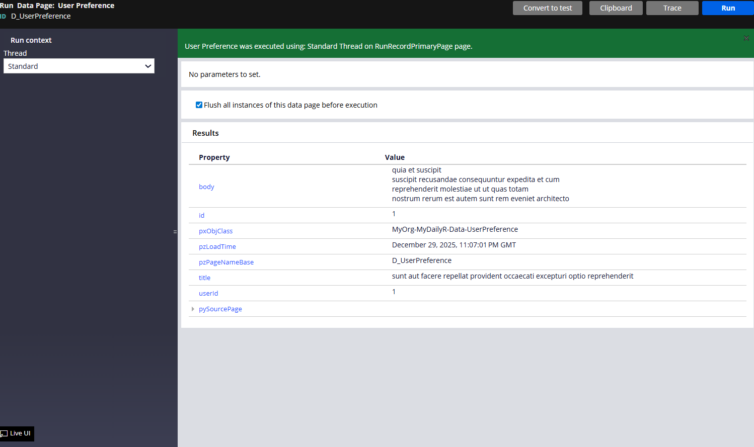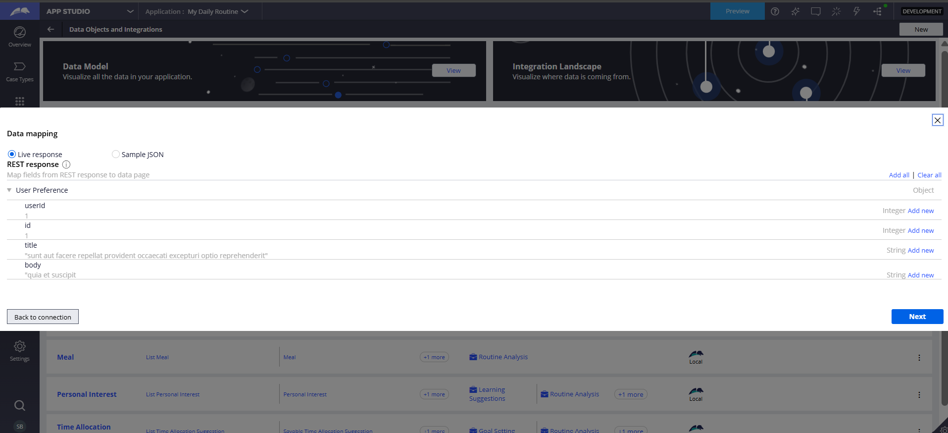 Pega parses the JSON response (Live or Sample). We visually map external fields (userId, id, title, body) directly to our Pega Data Model. This creates the necessary properties automatically.