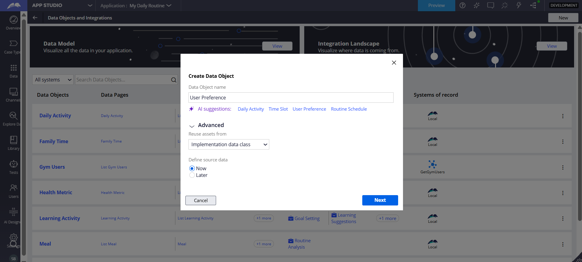 The process begins in the Data explorer. We define a new Data Object named 'User Preference'. App Studio allows us to immediately define the source data. Selecting 'Now' allows us to configure the integration immediately.