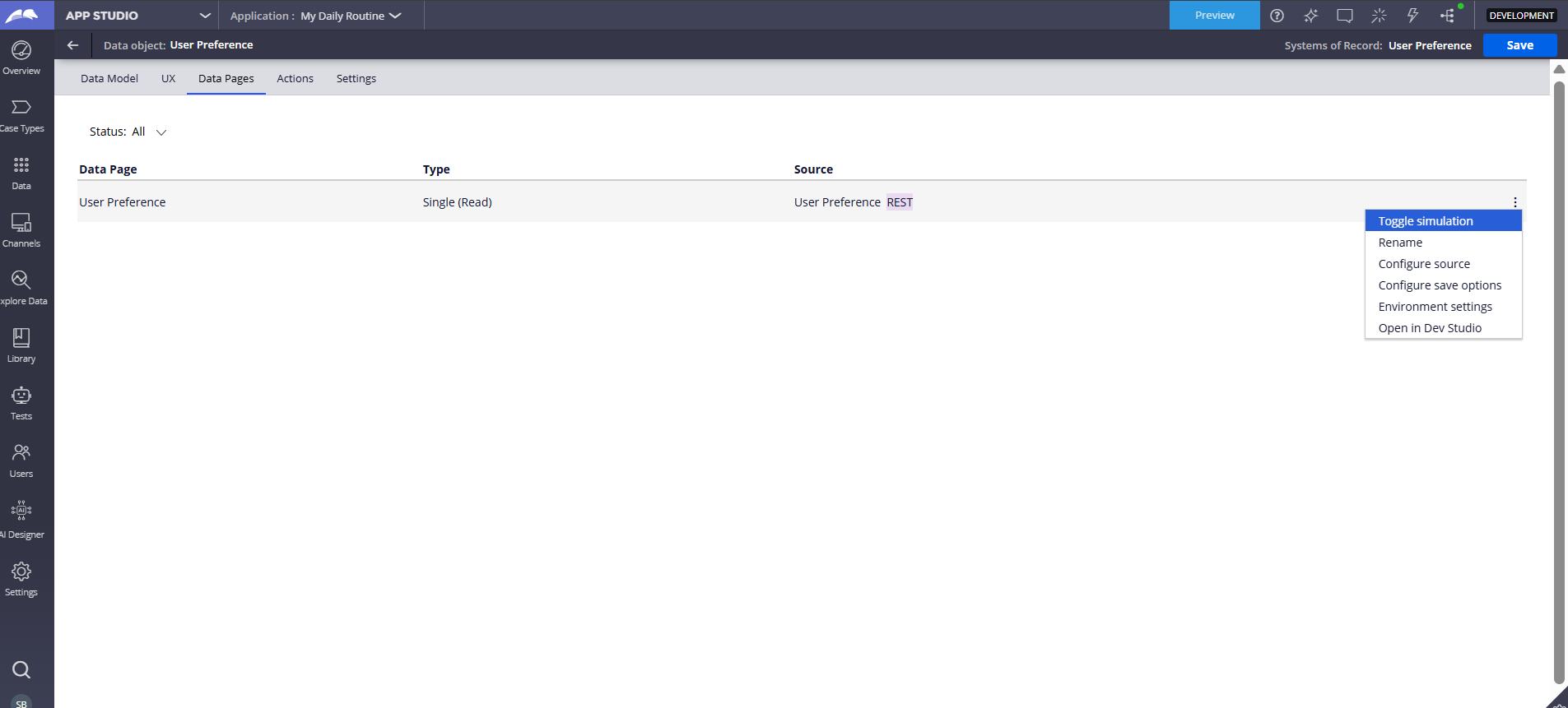 Once saved, the Data Page (Read) is visible in App Studio. From here, we can manage settings or open the object in Dev Studio for advanced configuration.