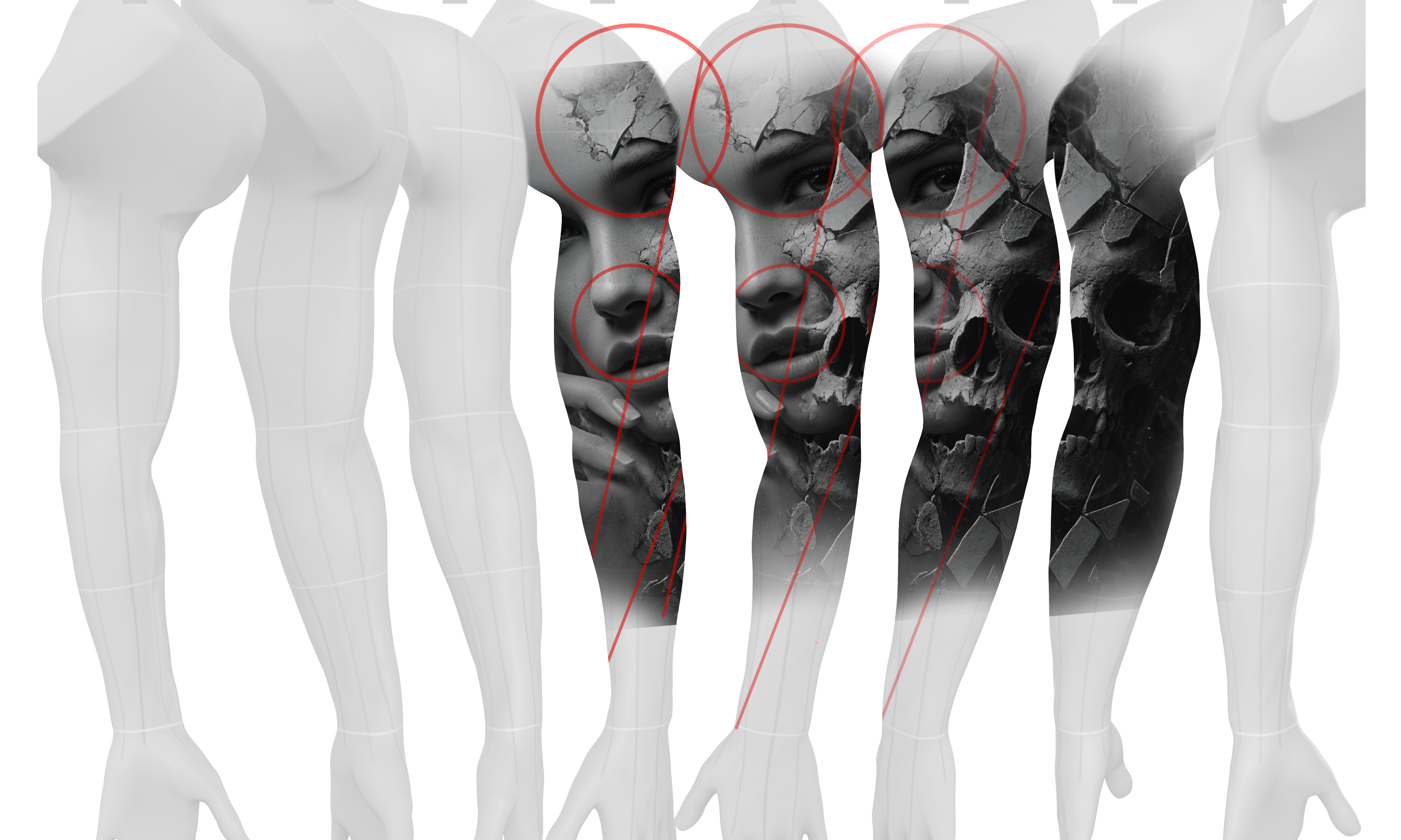 We begin with a 3D model of the arm. The red guide flow lines indicate muscle groups, areas of rotation, and focal zones. Understanding the shape of the canvas is critical for wrapping the image naturally around the limb.