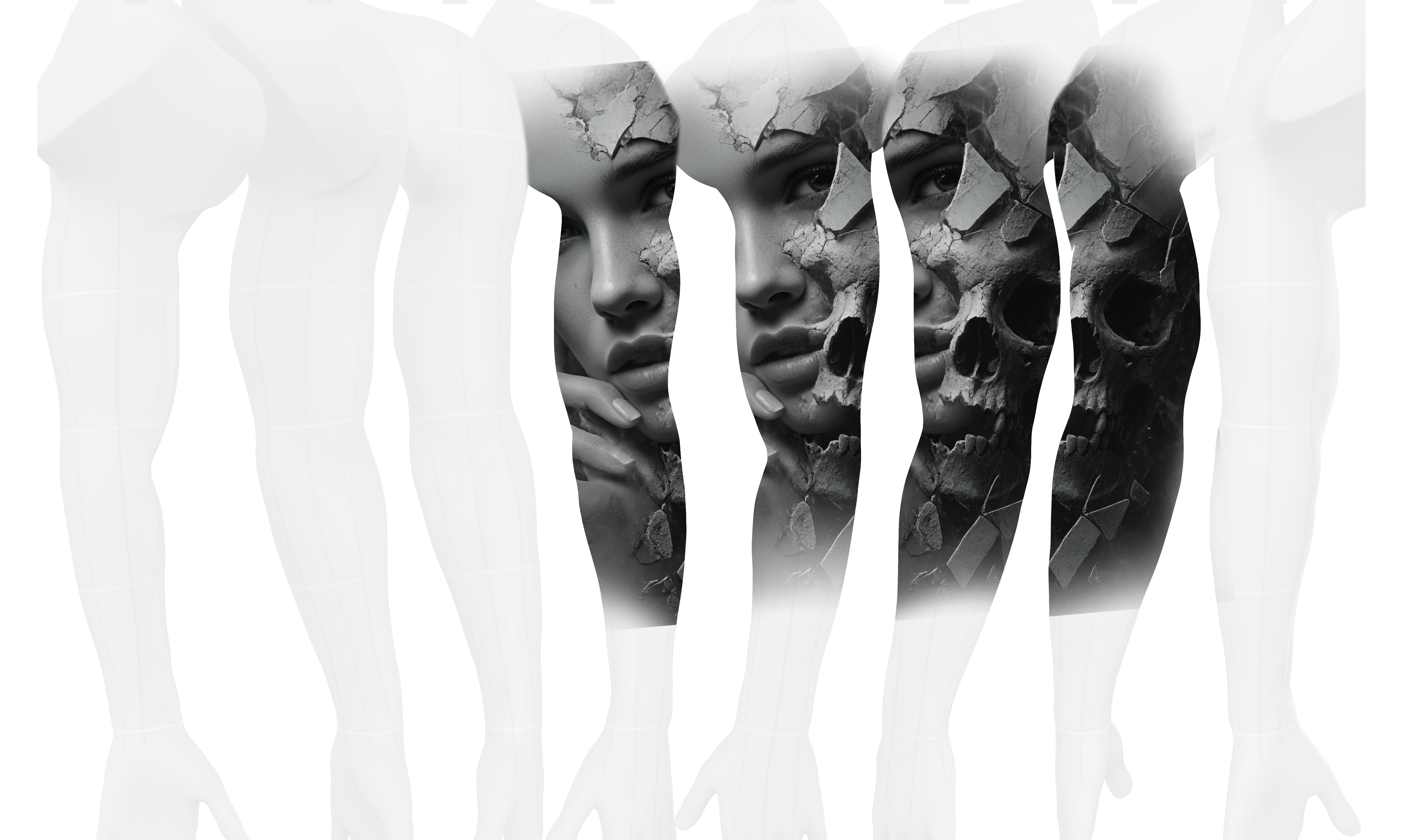 The core concept features a striking high-contrast portrait where beauty meets decay. A female face fractures into a skeletal form, symbolizing duality. This intricate shading requires careful placement on the body to maintain its visual impact.