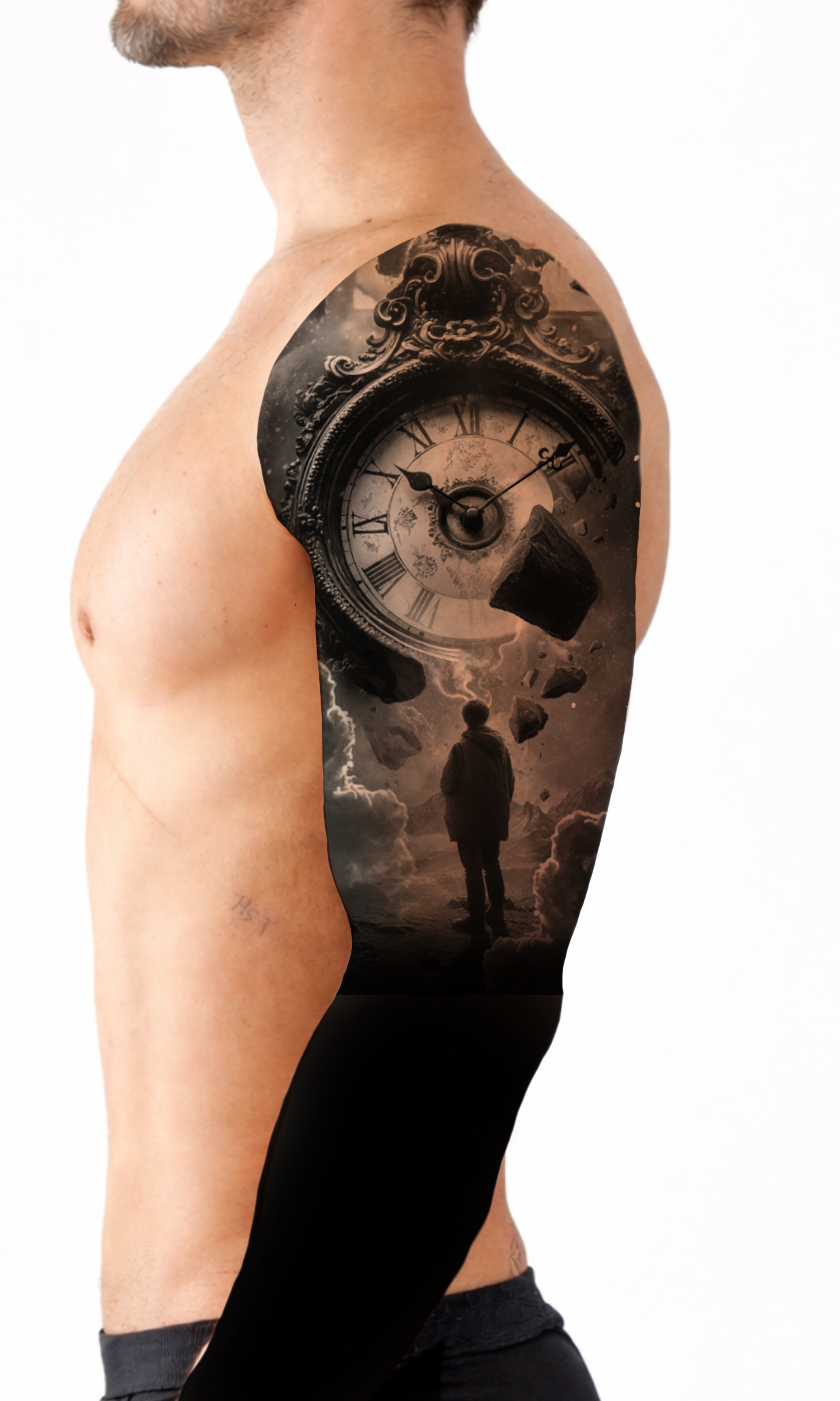 Superimposing the artwork onto the anatomical grid. The clock face aligns with the deltoid, while the figure anchors the composition on the tricep, utilizing the arm's natural verticality.