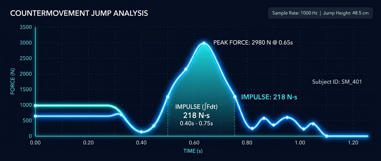 Data is output as force-time curves showing impulse, peak force and rate of force development