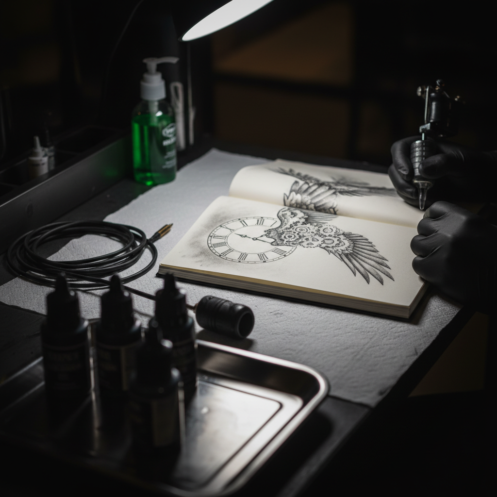 Use a high-quality shot of your station. It represents the 'lab' where the magic happens. It implies professionalism and readiness for the new year. Keep the lighting moody to match the ink aesthetic.
