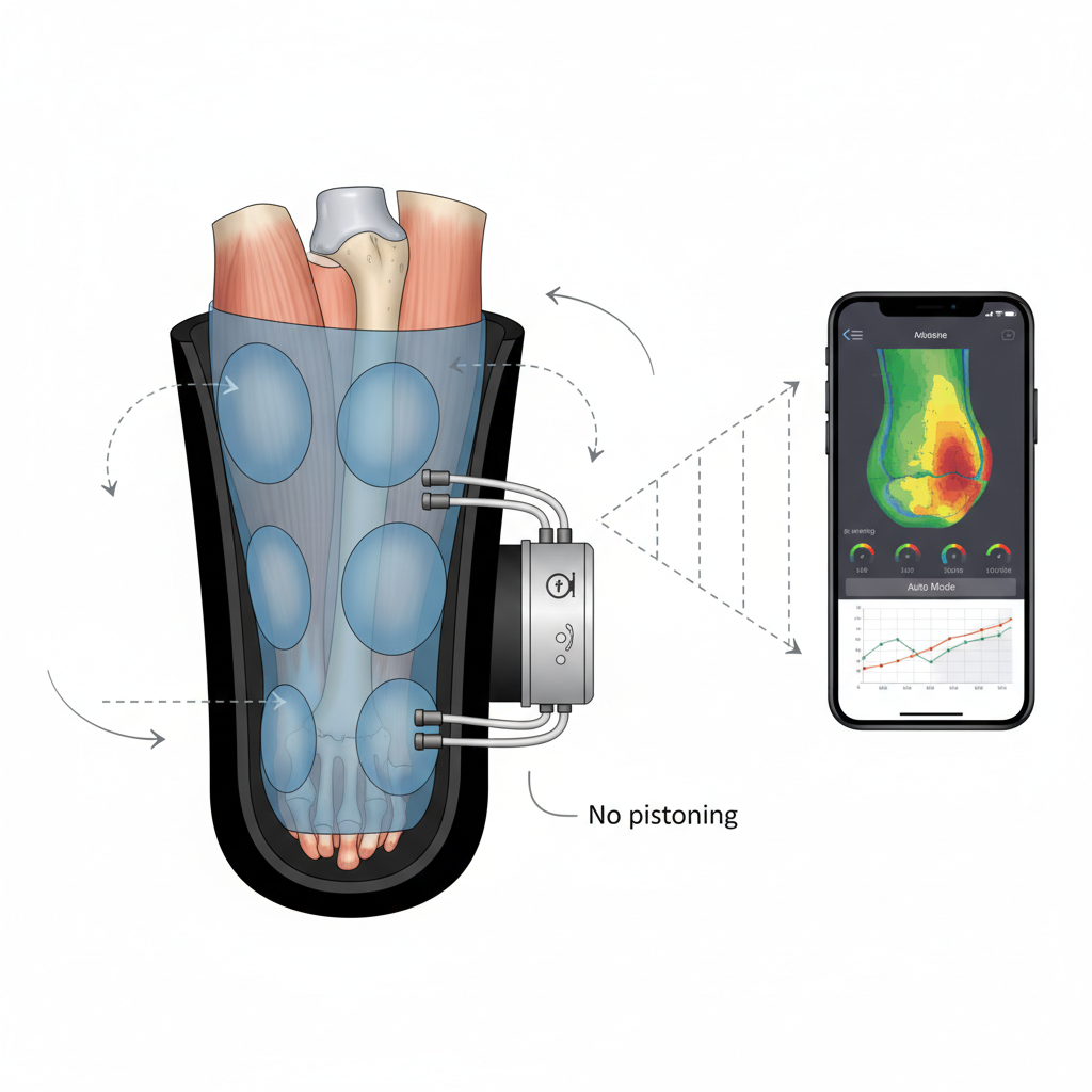 סקירה טכנית של שרוול פנאומטי חכם לתותבות רגל עם ניטור לחץ בזמן אמת, שיפור זרימת דם ומניעת פצעי לחץ לקטועי גפיים.